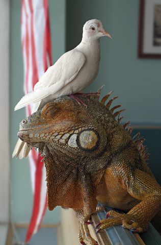 Yo, I'm trying to sleep here and dat darn feather duster is blocking my sun. It's finally a sunny day and my body felt so great to bathe in all that sun when wudden cha know it dis birdbrain lands on my head. Well the problem is that even though i look like I'm a big carnivore (meat eater) I'm actually a harmless vegetarian (a vegesaurus as they say). So even though to my cousin the Tyranasaurus rex old Cloe up there looks like a nice little treat, to me she's just annoying. Well at least she's good for something. She's up there munching on my old skin and helping me shed. And if you're like me you know what a problem shedding can be especially when you get old like me. I'm 13 years old you know and it hasn't been an easy life. I spent the first 9 years of my life with that crazy kid, Daniel Mintzer. All he did was bang on the drums all day. Finally the kid goes off to college so I get some peace and quiet and what do they do...they drag me to my new home at the vets office. Ok, it is a little better here. No more drumming (though when the office is closed, the kids who clean up after me play some of that awful rap music....yuk. I think I like the racket from the drums better).